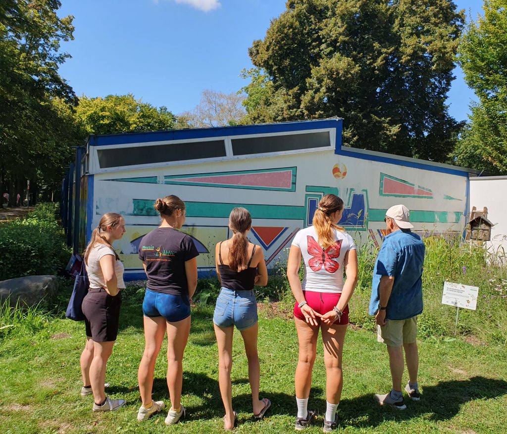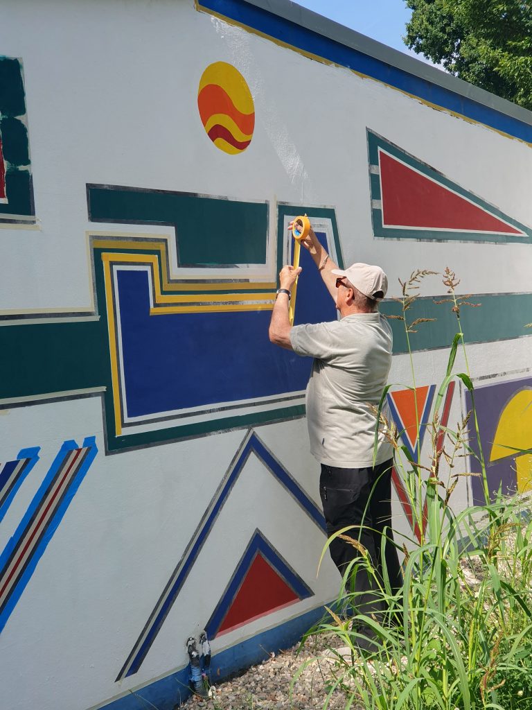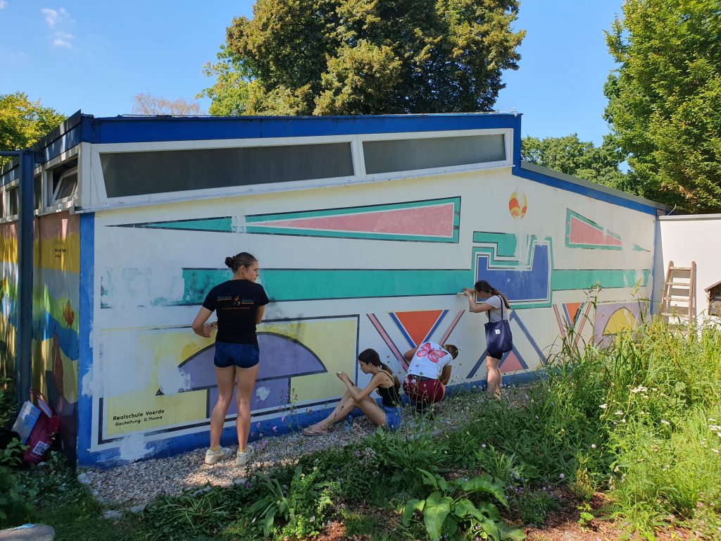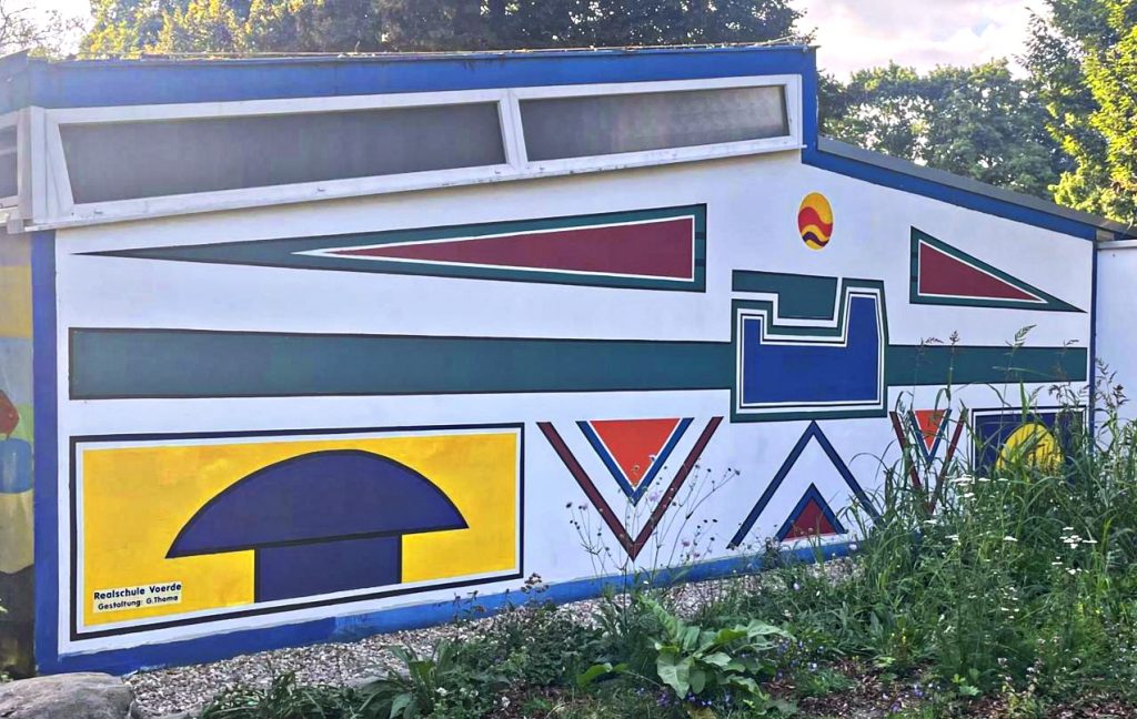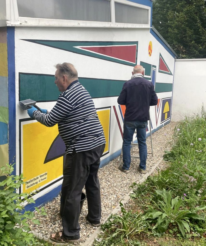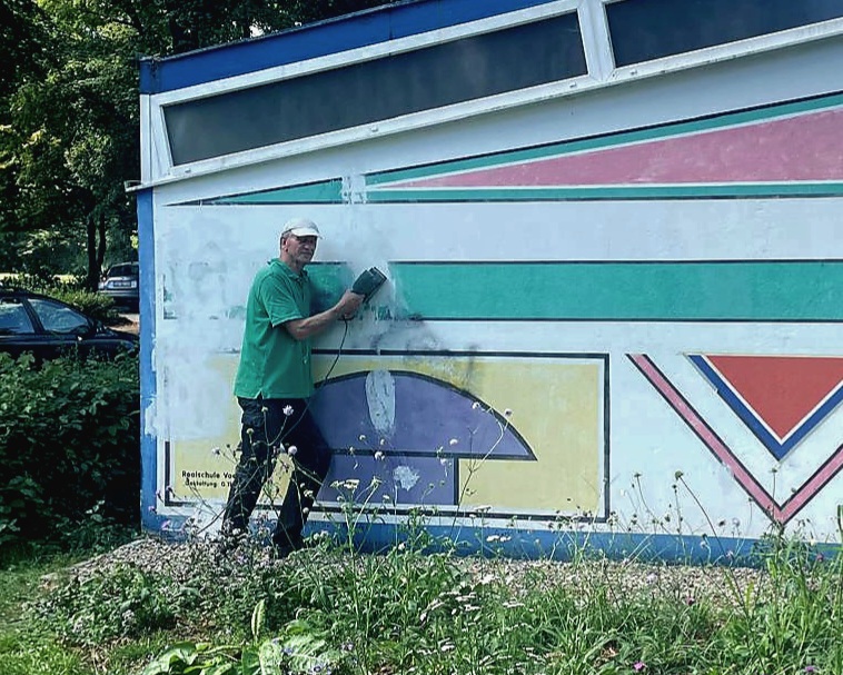 Im März 2025 war die Kunstfläche auch noch durch Graffiti-Schmierereien verunstaltet worden, was den Förderverein auf den Plan rief. Denn eine Reparatur war dringend nötig geworden. Wieder hatte der Förderverein die Idee, das Kunstwerk unter Beibehaltung der Ornamentik zu restaurieren. Und Herr Thoma, als Kunstlehrer längst pensioniert, ließ sich nicht zweimal bitten. Zusammen mit vier Schülerinnen der 12. Klasse des Gymnasiums Voerde wurde die Fassade in Angriff genommen. Ein Tag Vorbereitung der Fläche und drei Tage Bemalung waren notwendig, bis die Fassade nunmehr in neuem Glanz erstrahlt. Schließlich hat der Verein noch einen Firnis aufgetragen, damit zukünftige Graffiti keine Chance haben. Mit Ihrer jetzigen Bearbeitung, die einer Restaurierung gleichkommt, hat der Freibadeingang nochmal dazugewonnen