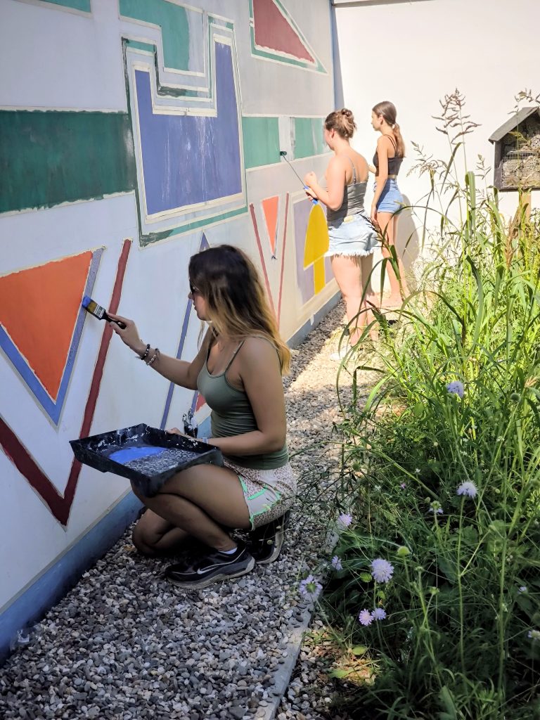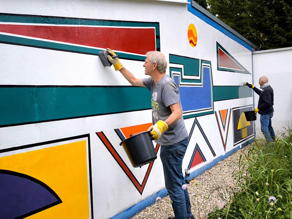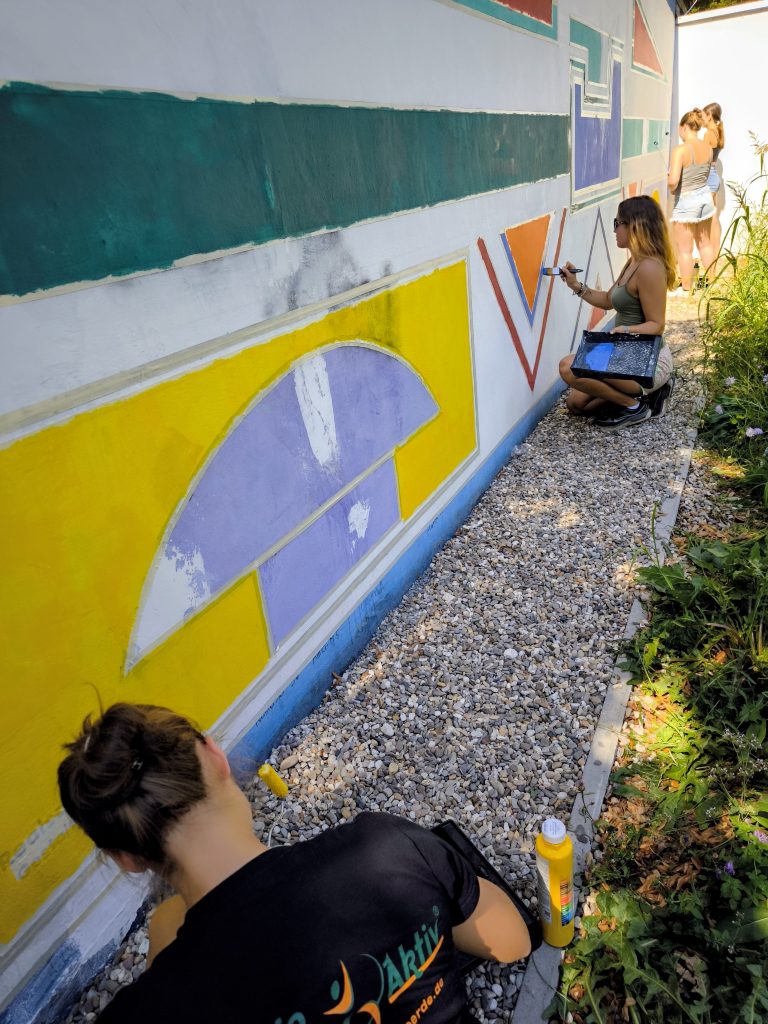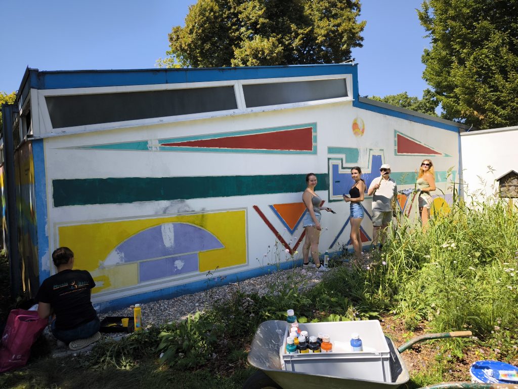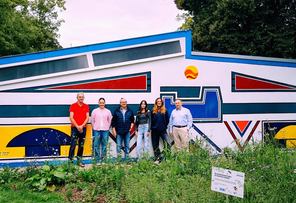 Im März 2025 war die Kunstfläche auch noch durch Graffiti-Schmierereien verunstaltet worden, was den Förderverein auf den Plan rief. Denn eine Reparatur war dringend nötig geworden. Wieder hatte der Förderverein die Idee, das Kunstwerk unter Beibehaltung der Ornamentik zu restaurieren. Und Herr Thoma, als Kunstlehrer längst pensioniert, ließ sich nicht zweimal bitten. Zusammen mit vier Schülerinnen der 12. Klasse des Gymnasiums Voerde wurde die Fassade in Angriff genommen. Ein Tag Vorbereitung der Fläche und drei Tage Bemalung waren notwendig, bis die Fassade nunmehr in neuem Glanz erstrahlt. Schließlich hat der Verein noch einen Firnis aufgetragen, damit zukünftige Graffiti keine Chance haben. Mit Ihrer jetzigen Bearbeitung, die einer Restaurierung gleichkommt, hat der Freibadeingang nochmal dazugewonnen